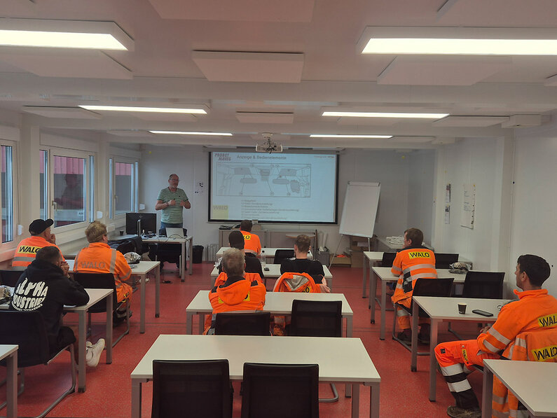 Im Rahmen der Ablieferung führte unser Schulungsleiter Martin Hirschi eine theoretische Schulung der Walzenführer sowie eine umfassende Einführung direkt an der Maschine durch. Mit dabei waren Bauführer und Walzenführer, die sich intensiv mit den Funktionen, dem Hybrid‑Antrieb und den Assistenzsystemen vertraut gemacht haben.
