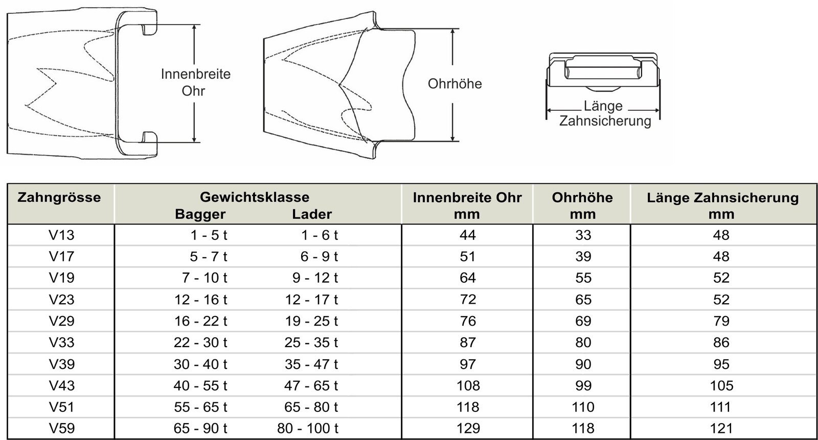 Wenn ein Zahn verschlissen ist, können auch die äusseren Markierungen abgenutzt sein. Beim Super-V Zahnsystem ist normalerweise die Systemgrösse im Inneren der Zahnkappe eingegossen, um sicherzustellen, dass die richtige Ersatzgrösse ausgewählt wird. Wenn die Systemgrösse fehlt oder unleserlich ist, finden Sie in den folgenden Abbildungen und der Tabelle Einzelheiten zum Messen verschlissener Teile, um die richtige Ersatzgrösse zu ermitteln.