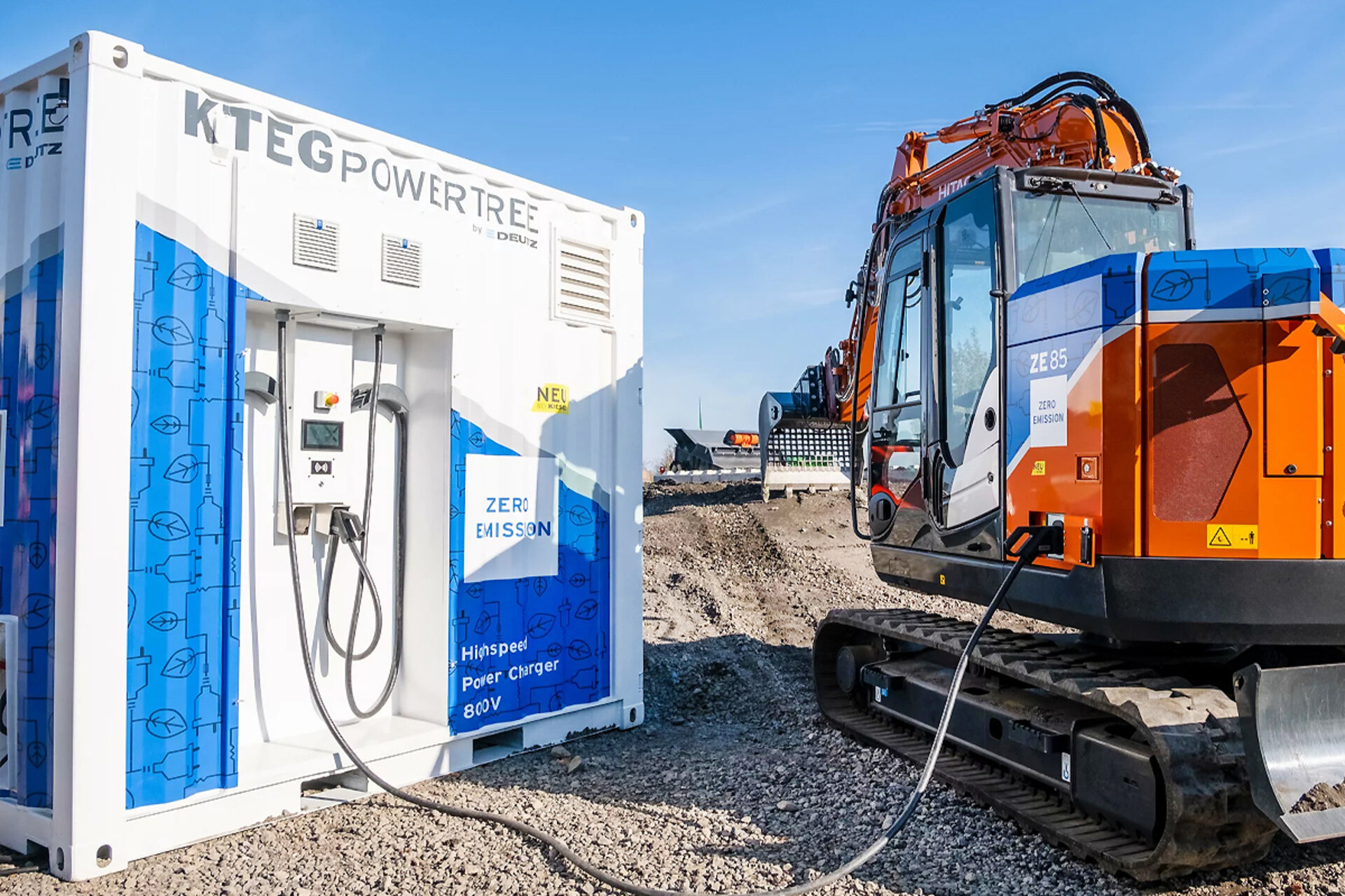 Avec le Powertree, une infrastructure de recharge rapide de 126 kWh est disponible sur le chantier, intégrée de manière robuste dans un conteneur de 10 pieds. Des points de charge puissants permettent de recharger des machines de chantier, mais aussi des voitures électriques et des outils électroportatifs.